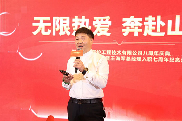 集團(tuán)董事長(zhǎng)楚科奇首先發(fā)表了致辭。他回顧了榮盛窯爐工程八年來(lái)從創(chuàng)業(yè)維艱到行業(yè)頭部的奮斗歷程。他指出,每一份成績(jī)的取得,都凝聚著全體員工的智慧、汗水與“無(wú)限熱愛(ài)”。楚總向入職七周年的王海軍總經(jīng)理表達(dá)敬意與感謝,高度評(píng)價(jià),擁有 領(lǐng)導(dǎo)力和市場(chǎng)洞察力。他特別強(qiáng)調(diào),在王總的帶領(lǐng)下,工程公司今年業(yè)績(jī)超越預(yù)期,創(chuàng)下歷史新高,為公司樹(shù)立了新的發(fā)展標(biāo)桿。同時(shí),楚總也對(duì)朱廣州帶領(lǐng)的工程項(xiàng)目部、白建偉負(fù)責(zé)的生產(chǎn)部以及集團(tuán)管理層表達(dá)了充分肯定,感謝各團(tuán)隊(duì)為公司發(fā)展作出的重要貢獻(xiàn)。后,楚總號(hào)召全體榮盛人,以八周年為新的起跑線,憑借對(duì)事業(yè)的無(wú)限熱愛(ài)與堅(jiān)定信念,共同驅(qū)動(dòng)榮盛巨輪,在時(shí)代的浪潮中破浪前行,開(kāi)辟更加壯麗的征途。